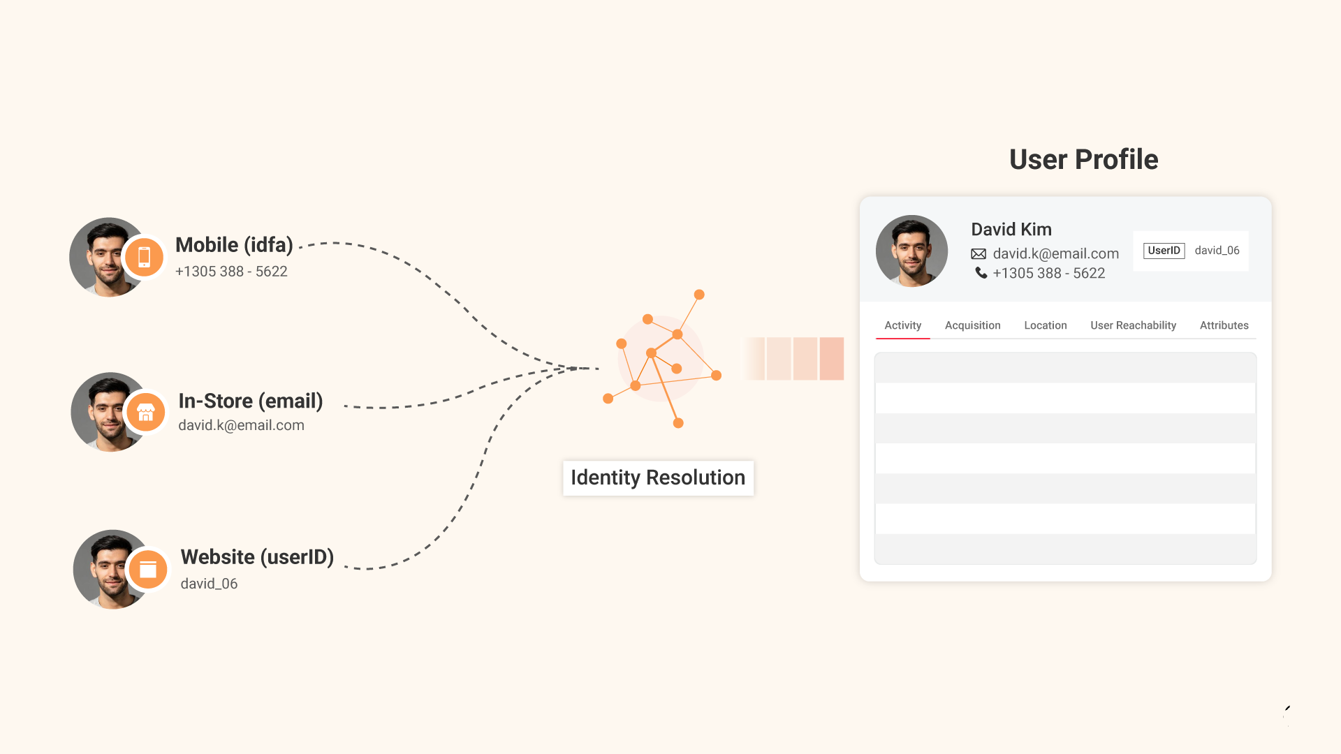 Final profile A → UserID=U123, Email=alice@example.com, Mobile=+15551234567, DeviceIDs=[DWeb01, DApp01]